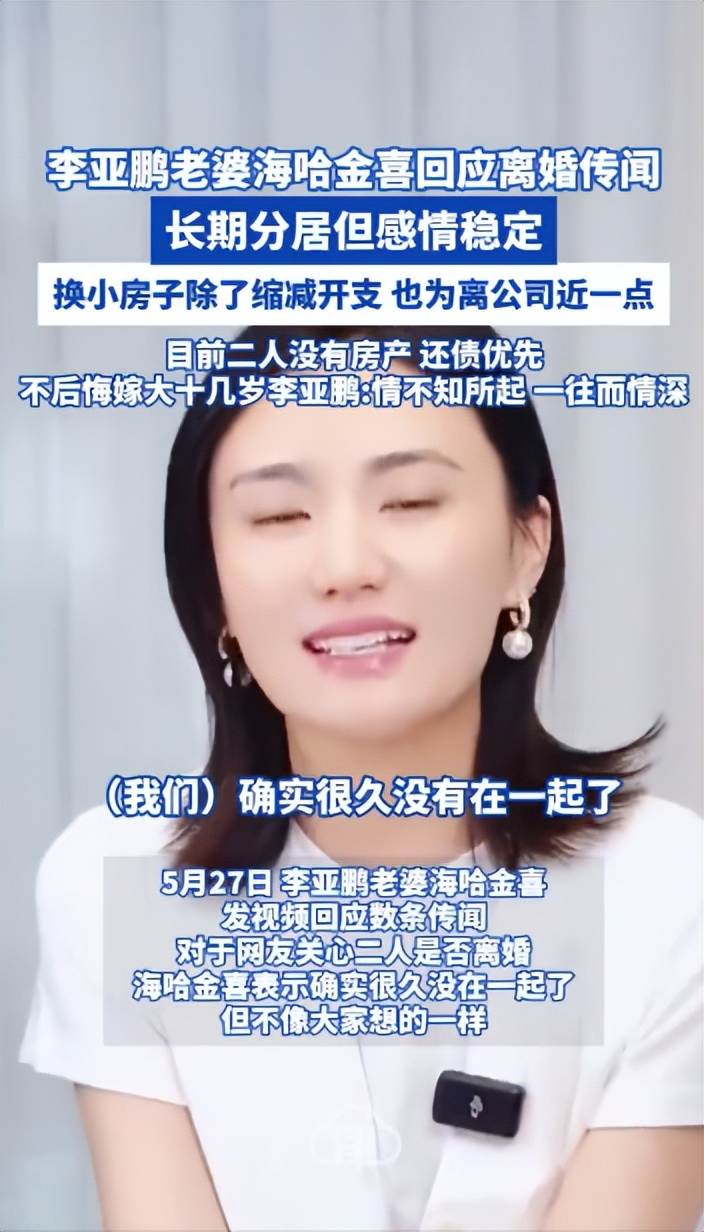 5月27日,李亞鵬妻子海哈金喜發視訊回應數條傳聞,對于網友關心二人是否離婚,海哈金喜表示確實很久沒在一起了,但不像大家想的一樣。「春節后鵬哥開始上山下鄉給大家找好的茶葉,我從去年底也是成立了自己的工作室,就有很多雜事,所以確實兩個很久沒有在一起了,但是并沒有出什麼問題或者離婚。」