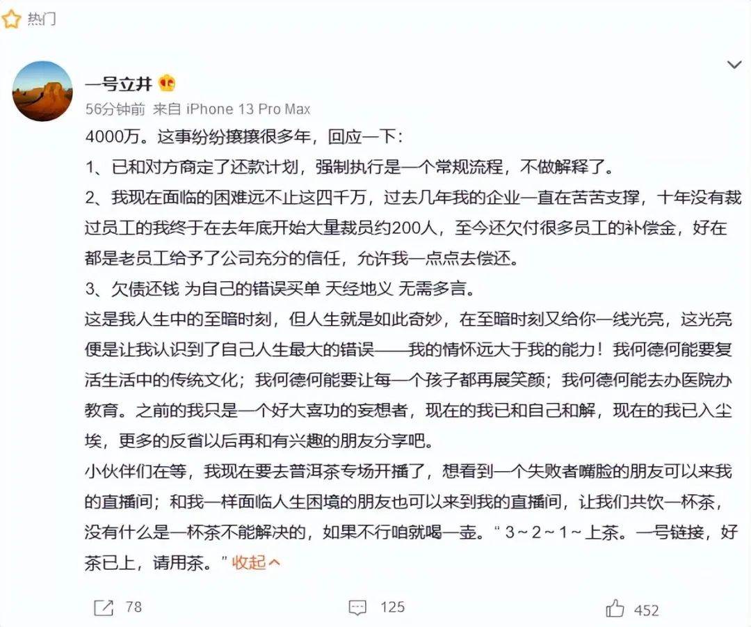 他還透露自己現在面臨的困難遠不止這四千萬,去年底開始大量裁員約200人,至今還欠付很多員工的補償金。李亞鵬還表示「欠債還錢,為自己的錯誤買單天經地義,無需多言」。