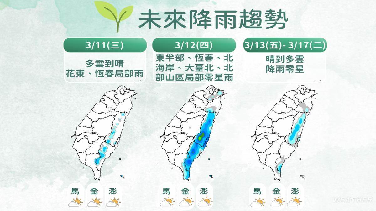 「天氣風險」提醒,近期預估到下週三水氣都偏少,各地可維持晴到多雲天氣,僅迎風面北海岸、東北角及東部區域性有零星短暫陣雨,但要注意夜間清晨受輻射冷卻影響帶來的日夜溫差變化,早出晚歸務必注意保暖。