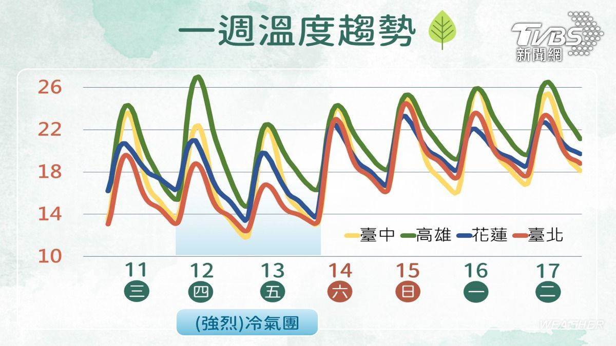 「天氣風險」預估,冷氣團要到週六(14日)才會逐漸減弱,白天高溫可回升至23度左右,中南部有25度左右高溫,不過夜間清晨仍有輻射冷卻帶來明顯降溫,各地市區低溫約14~16度,平地空曠處、沿海及近山區仍有11~13度低溫機會。