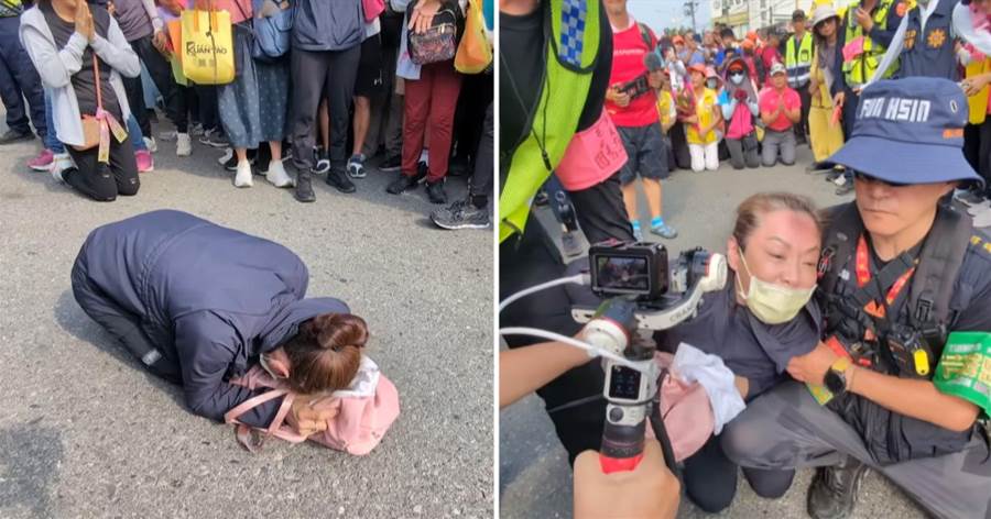 女子跪地哭求白沙屯媽祖保佑父親,接連用力磕頭20多下。(圖/翻攝自白沙屯拱天宮臉書)