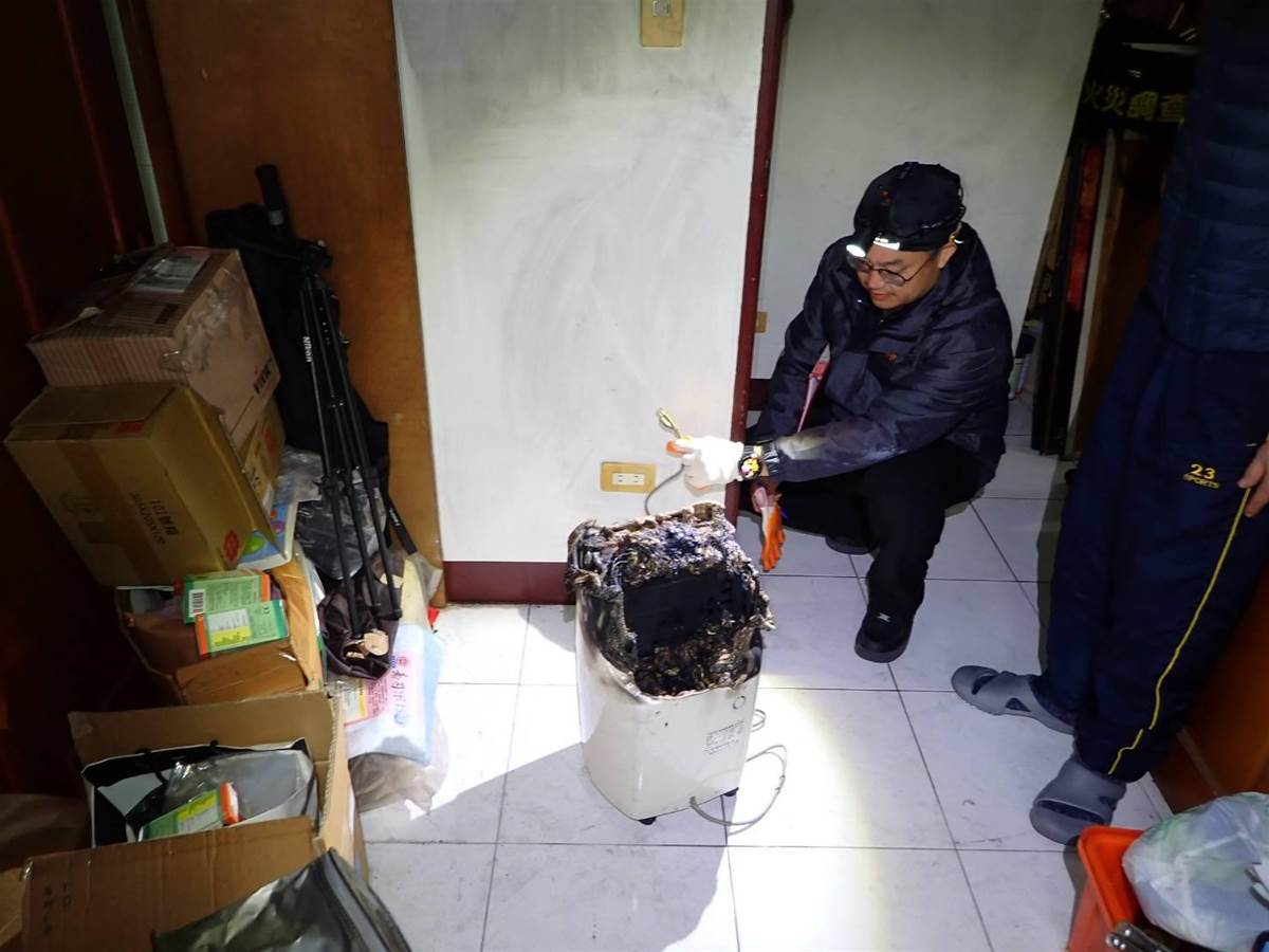 火災調查人員勘察除濕機自燃情形。(圖/基隆市消防局提供)