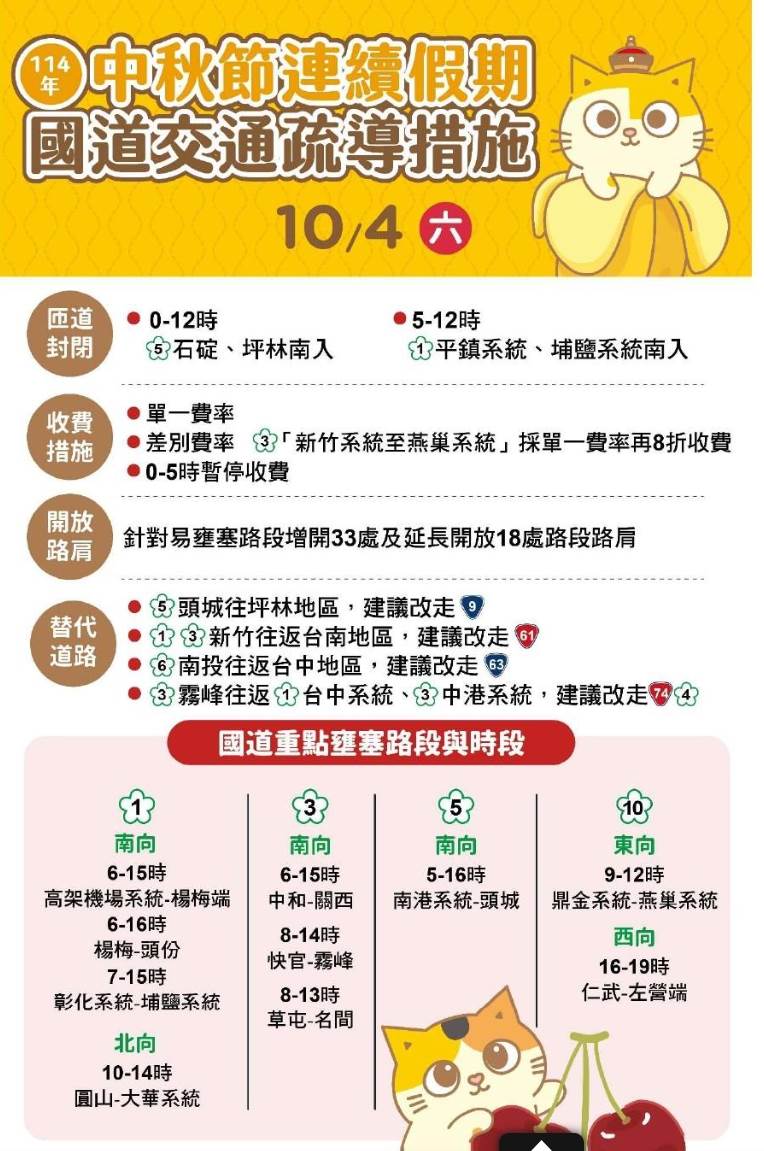 高公局呼籲,西部國道南向用路人儘量于12時後出發,國5南向用路人建議17時後出發,節省寶貴時間。