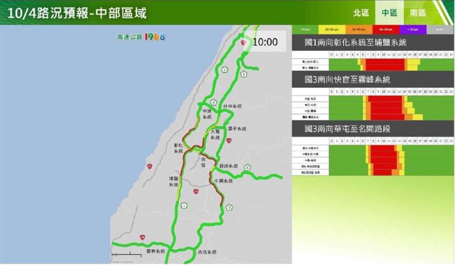 自清晨6時起,南下車流量明顯增加,國1南向楊梅至新竹、王田至彰化系統,國3南向三鶯至龍潭、北向新店至南港系統,以及國5南向南港系統至石碇等多處車速緩慢。高公局預判,國1南向高架機場系統至楊梅端、彰化系統至埔鹽系統、國3南向中和至關西、草屯至名間等9處皆為今日上午重點壅塞路段。