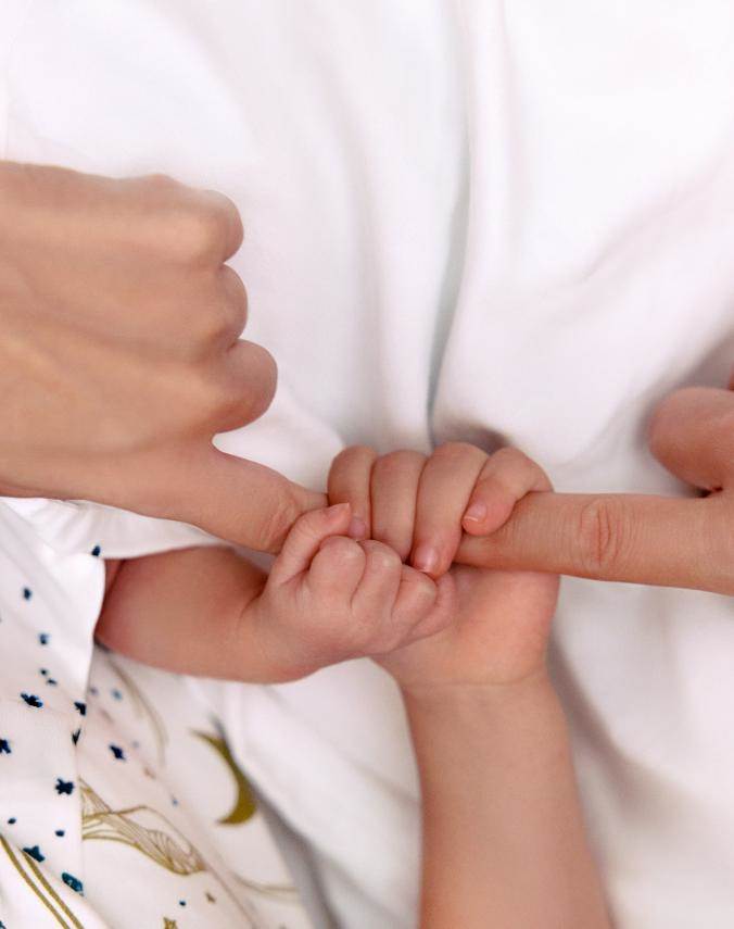 他們一家四口也太幸福了吧,女兒握著他們的手指,二胎的手放在最上面。