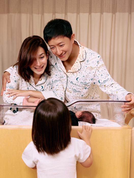 照片中的兩人穿著同款式的星空睡衣,眼神溫柔的盯著躺在嬰兒床里的孩子。