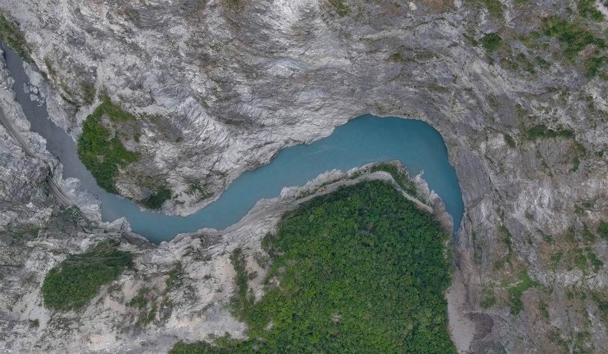 花蓮秀林鄉立霧溪台8線靳珩隧道西口的舊台8線路段,因山壁崩塌阻塞河道也形成堰塞湖。(圖/林保署提供)
