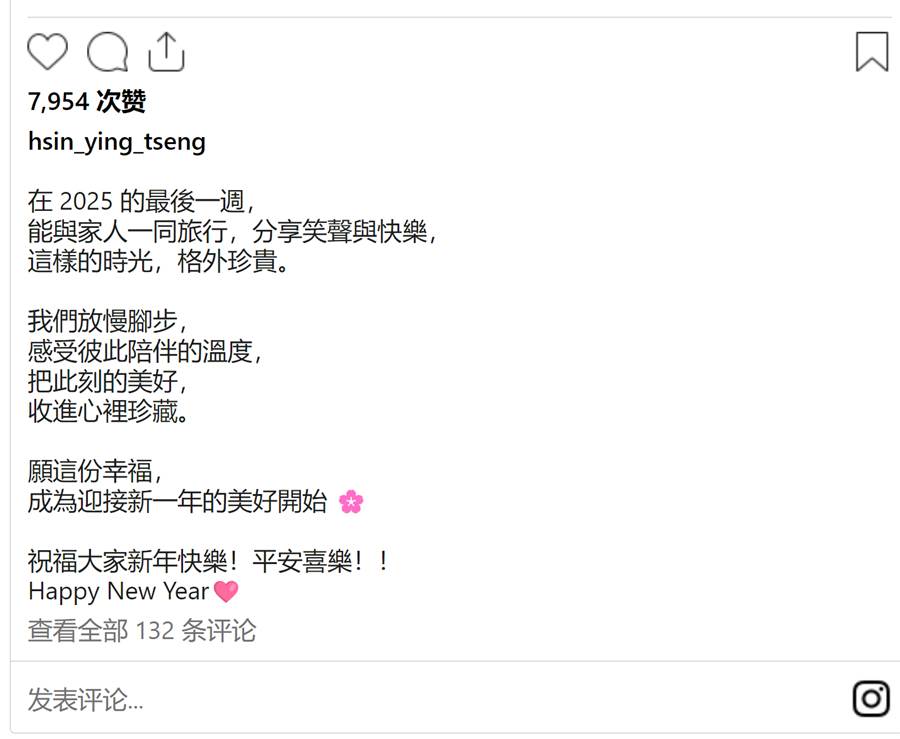 而跨年當晚,曾馨瑩則PO出一家人合照,並表示能在2025的最後一週與家人一同出遊,「分享笑聲與快樂,這樣的時光,格外珍貴」。由于家族知名且受到矚目,因此這樣閒暇的團聚時光更得來不易,「願這份幸福,成為迎接新一年的美好開始,祝福大家新年快樂!平安喜樂!!Happy New Year」。