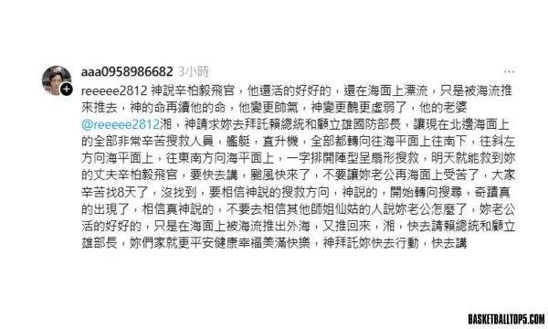 近日,一名自稱神職人員的網友施昆池在社群媒體發文,並標註辛柏毅飛官的妻子,宣稱辛員「仍在海面漂流」,並表示「神指示」搜救應往特定方向調整。他在貼文中呼籲辛妻向總統及國防部長轉達相關內容,並聲稱「若依照指示調整搜尋方向就能在隔日找到人」。