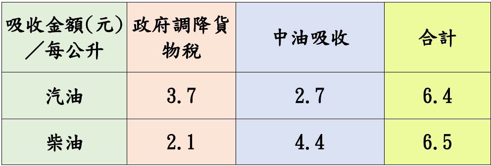 中東情勢依舊緊張且衡酌亞鄰國家油價補貼亦高之情形,為照顧國內民生與平穩物價,4月27日至5月3日中油持續吸收以維持亞鄰最低價,汽、柴油合計各吸收2.7元及4.4元,吸收幅度較上週略為縮小。