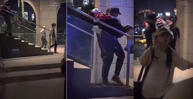 監視器拍下的畫面顯示,兩名黑衣男子正艱難地抬著該名紅衣男子下樓,還有一人負責扶著下肢。畫面中,一名戴著卡其色帽子的工作人員在前方指揮。值得注意的是,現場人員試圖以衣物遮掩被抬男子的身軀,有人更刻意阻擋拍攝。