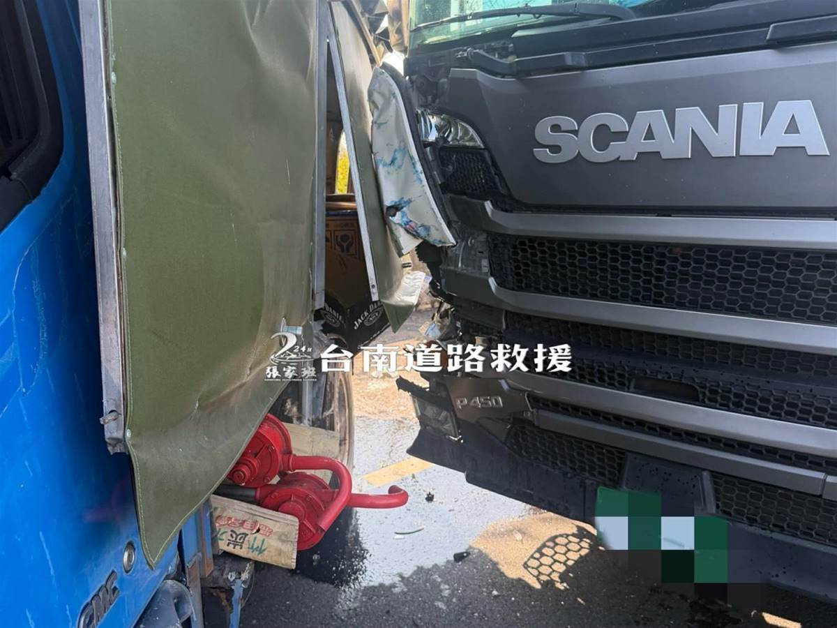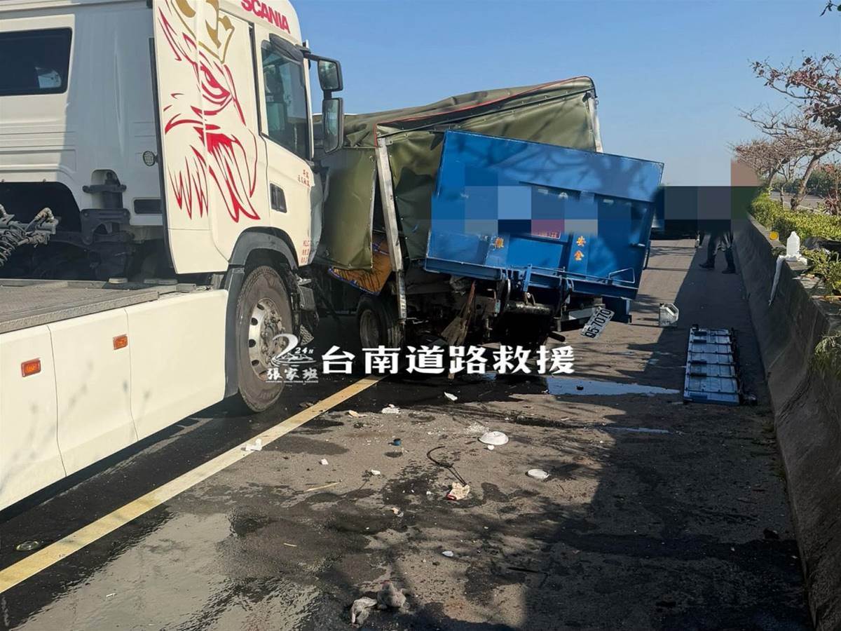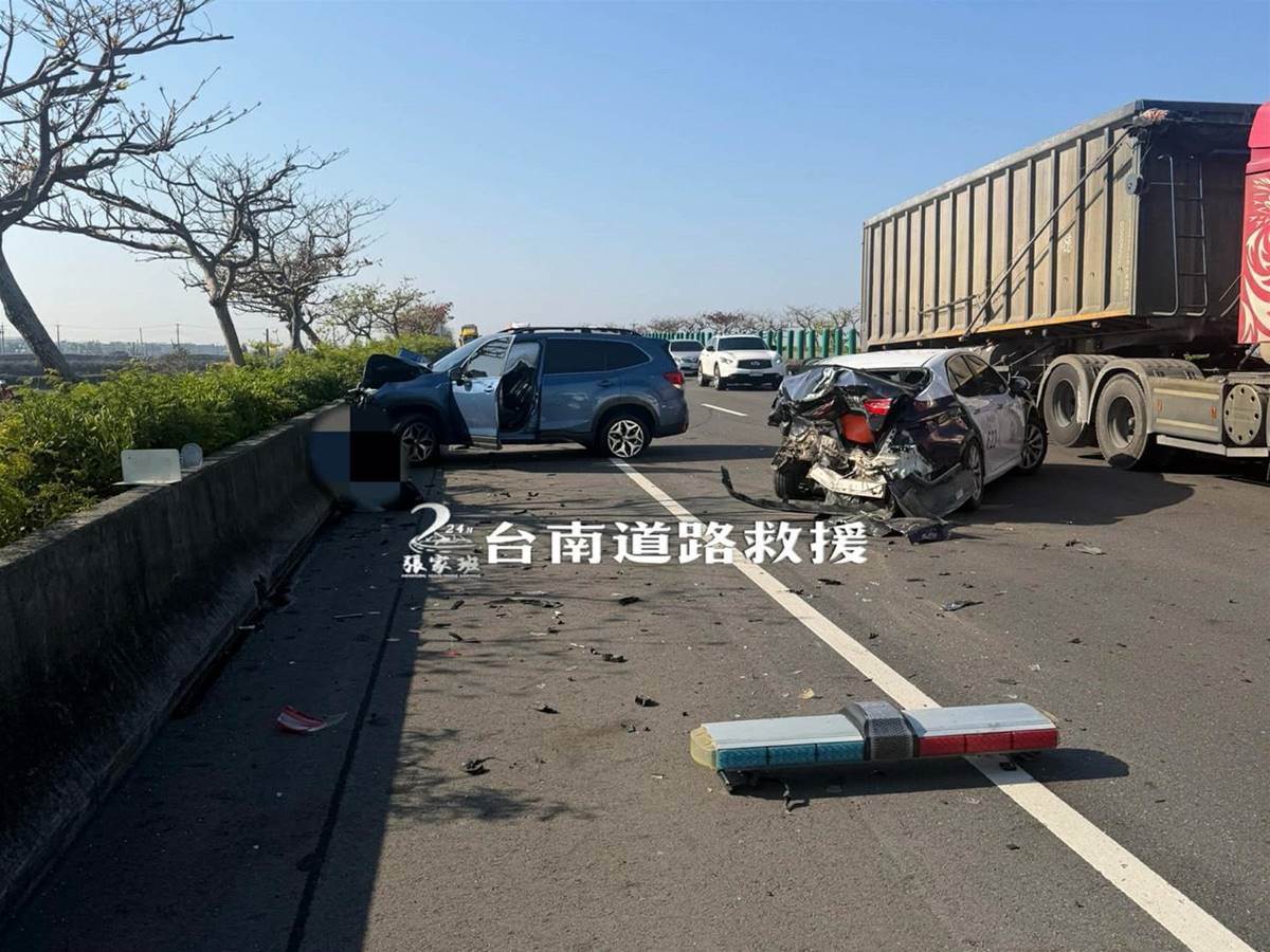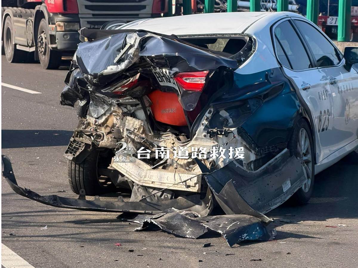 嘉義布袋臺61線西濱快速道路今(18日)發生驚悚事故,據調查上午8點左右先是有一輛故障停路肩的貨車,被大卡車追撞,員警獲報到場處理時,警車也被追撞,車尾當場被撞到炸裂。