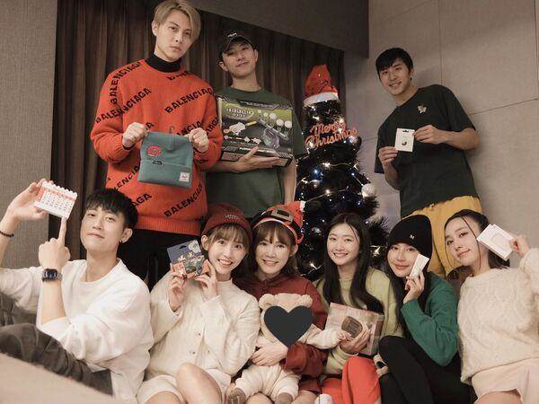 粿粿與藝人好友們歡慶聖誕節,王子(後排左一)竟巧合地在范姜彥豐(前排左一)與頭上拿「綠帽」合照。(圖/翻攝自粿粿IG)