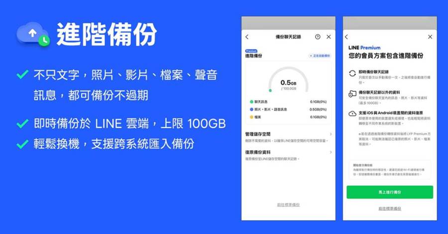 LINE Premium功能1:進階備份文件不過期允許用戶在雲端儲存高達100GB的文件,且不設過期日期。另外,即便是更換裝置,也能輕鬆匯入,不用怕聊天紀錄遺失。