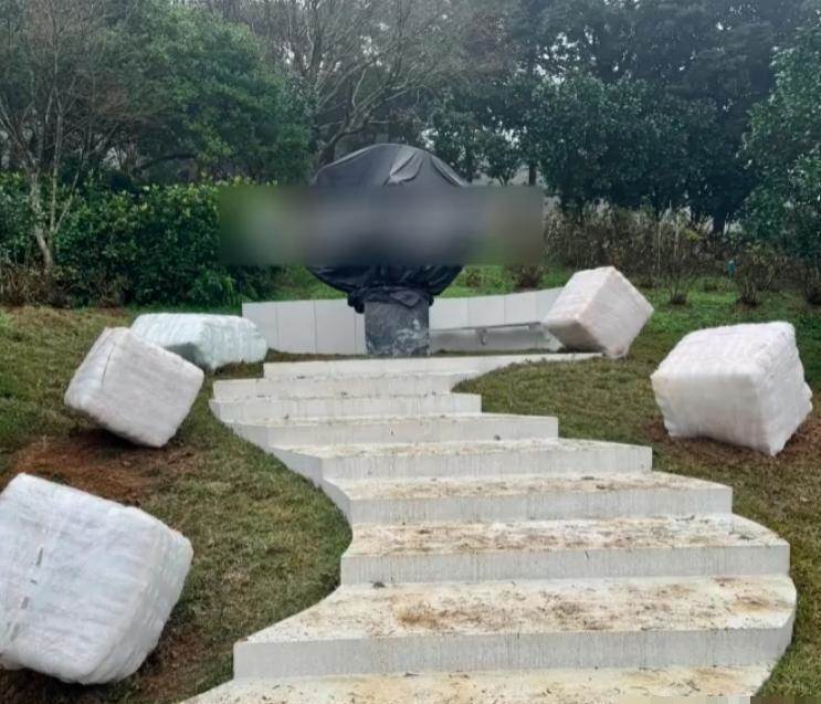如今雕像已經完工了,下面是黑色的大理石基座,上面用黑色塑料布擋著。從下面到上面還有9個白色的臺階,而在臺階兩側還有5個小雕像。光是看著這一片潔白,就讓人感受到聖潔的氣息。