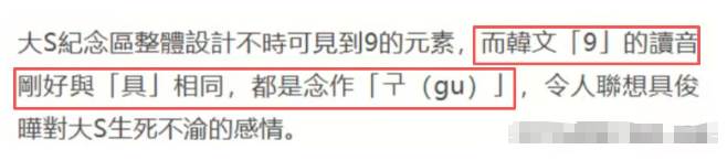 據媒體稱大S紀念區內可以看到很多的數字「9」,韓文中9的發音剛好和具相同,讓人聯想到具俊曄對大S至死不渝的感情。