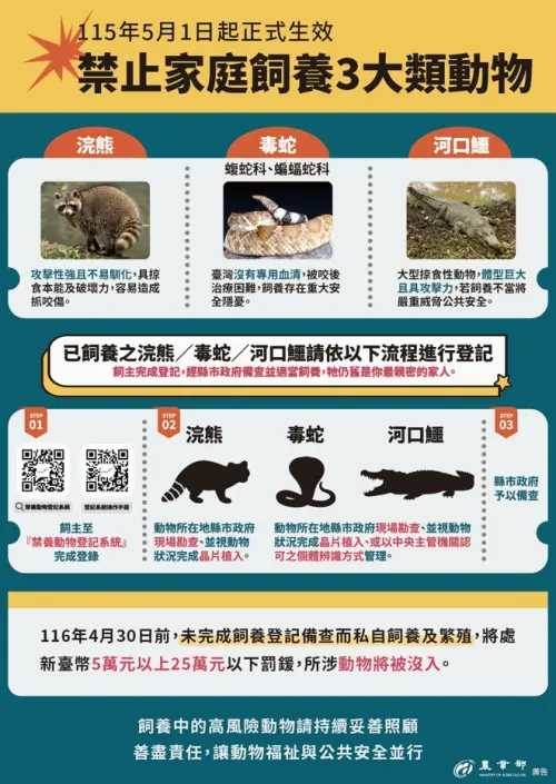 有飼養特殊寵物的民眾注意了!農業部日前修正「指定禁止飼養輸入或輸出之動物」名單,新增禁止國人飼養浣熊、河口鱷、蝮蛇科及蝙蝠蛇科(眼鏡蛇科)等具高度危險性的動物,新制將自 2026 年 5 月 1 日起生效。若在公告前就已飼養這些動物的民眾,請務必記得要在 2027 年 4 月 30 日前至「禁養動物登記系統」辦理登記備查,經審核許可後才可以繼續飼養,以免面臨重罰並與愛寵被迫分離。