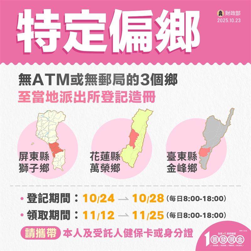 花蓮縣萬榮鄉、台東縣金峰鄉、屏東縣獅子鄉由當地派出所或分駐所造冊後發放。