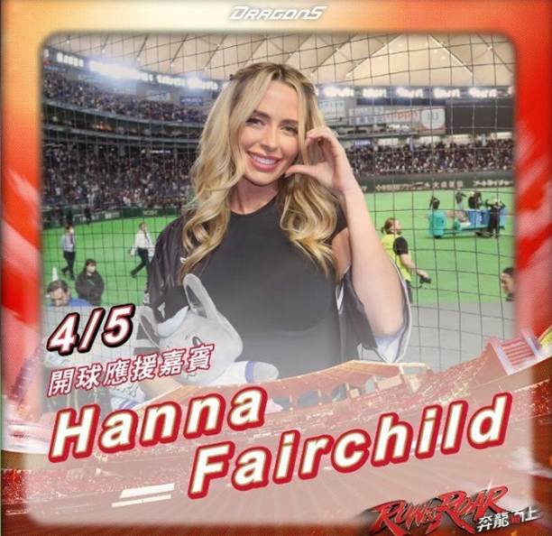 化身一日小龍女本次漢娜的訪臺行程誠意十足,除了將穿上龍隊戰袍擔任賽事開球嘉賓外,更將親自參與臺式應援文化,于比賽開始後登上天母棒球場應援舞臺,與啦啦隊「Dragon Beauties」小龍女同臺應援,陪伴現場所有龍迷一起吶喊為龍隊加油;此外,比賽期間她也將現身轉播室,與主播、球評進行即時互動,分享她對台灣棒球的初體驗,以及與費仔的場邊趣事。