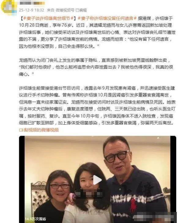 說到許紹雄,他是10月28號的凌晨離世的,大家都知道他離世是因為癌癥。
