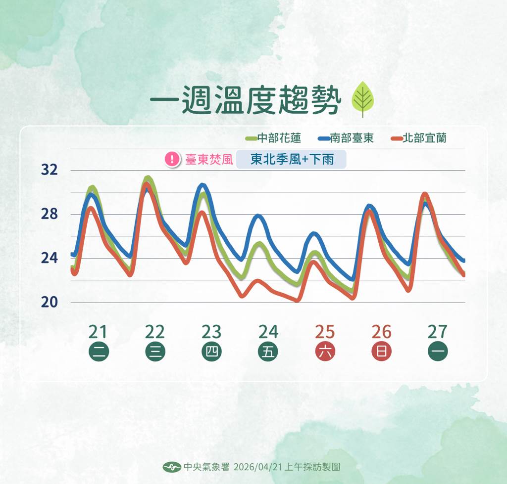 氣象署提到,4/25(六)東北季風及華南雲雨區東移影響,水氣仍多,各地天氣較涼;西半部地區有短暫陣雨或雷雨,並有局部較大雨勢發生的機率,整體降雨到晚上後趨緩。4/26(日)東北季風減弱,各地氣溫回升,水氣減少;4/26、4/27(一)各地大多為多雲到晴,僅東半部地區及恆春半島有零星短暫陣雨,午後中南部山區有零星短暫陣雨。