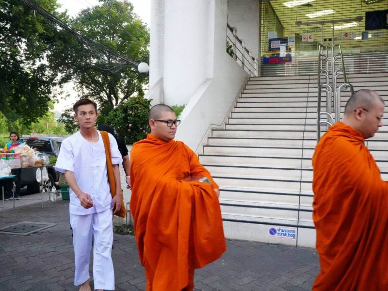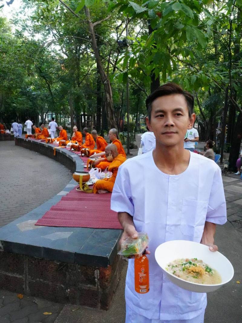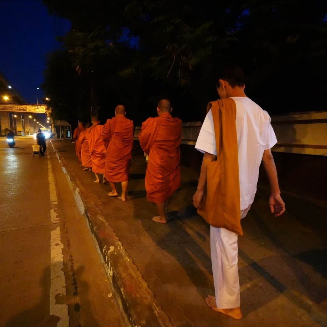 然而無法如阿翔所願,念經後修行體驗並未就此結束,早上六點他必須跟隨寺廟師父一同赤腳外出化緣,讓他震驚的是,當地居民都會提前準備化緣的食物,包括粿條、餅乾、飲料、水果等,化緣得到的食物師父們會在當天中午食用,雖然修行者無法食用化緣所得,但寺廟會另外準備餐點給他們吃。