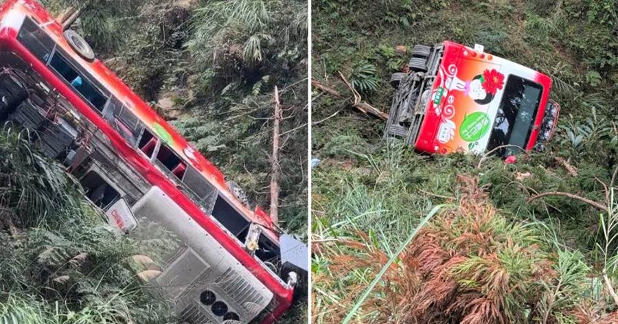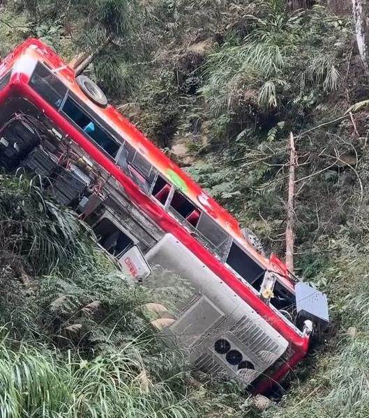 今天(9日)中午在南投杉林溪風景區發生巴士墜入近40公尺、約13層樓高的深谷的驚悚意外,目前已知4人重傷、2人輕傷,另有1人命危,司機則是未受傷,現場驚悚影片也曝光。