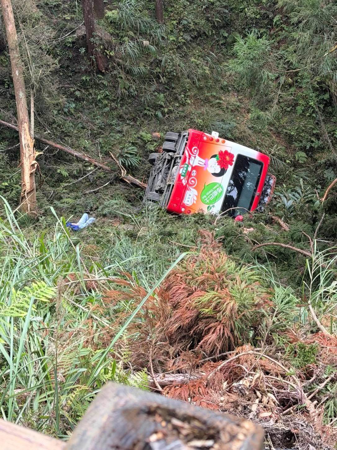 據了解,巴士墜入的深谷近40公尺深,約13層樓高,據民眾授權提供的影片顯示,車身受損相當嚴重,窗戶幾乎全破,車內物品幾乎全噴出車外,現場共有4人重傷、2人輕傷,另有1位66歲的男性已經沒有呼吸心跳,目前7名乘客全都在南投竹山秀傳醫院被救治,巴士的司機則是未受傷自行脫困,外傳傷者中有3人是被拋飛車外,可見當下的慘烈。
