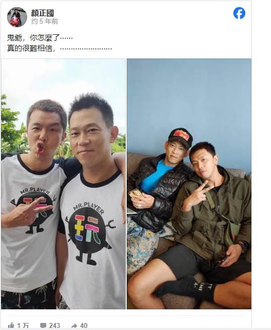 只見當時顏正國因不捨黃鴻升年僅36歲就離開人間,感慨寫下「鬼爺,你怎麼了……真的很難相信……」。沒想到事隔5年後的如今,顏正國也隨之離開,讓網友們不捨感嘆「兩個都走了」、「你們一起在天堂合體了……」。