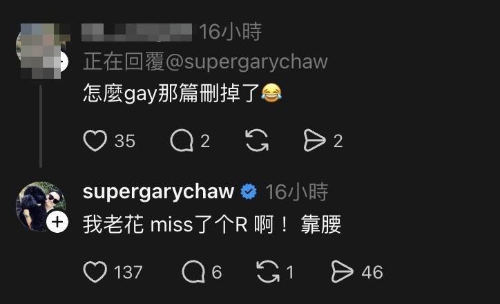 對于他手誤打錯名字,引發討論後也迅速刪文重新發,被網友詢問:「怎麼gay那篇刪掉了」,曹格也笑回:「我老花 miss了個R 啊!靠腰」,十分真性情的互動,也讓不少網友紛紛曬出手誤發文的截圖逗他。