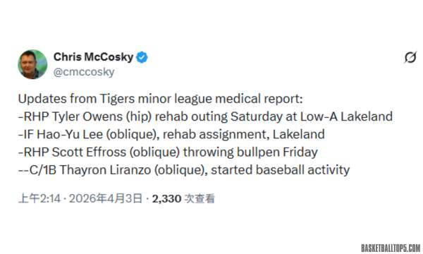 目前老虎隊 3A 體系的內野競爭者們表現不盡理想,在開季初期陷入打擊低潮與守備失誤的泥淖。去年在 3A 繳出 .243 打擊率、14 轟、22 盜的全能數據,李灝宇早已證明自己具備大聯盟等級的長打火力和速度。加上他已進入球隊的 40 人名單,只要他在復健賽找回手感,重回 3A 之後只要維持表現,隨時可能迎來生涯的大聯盟首秀。