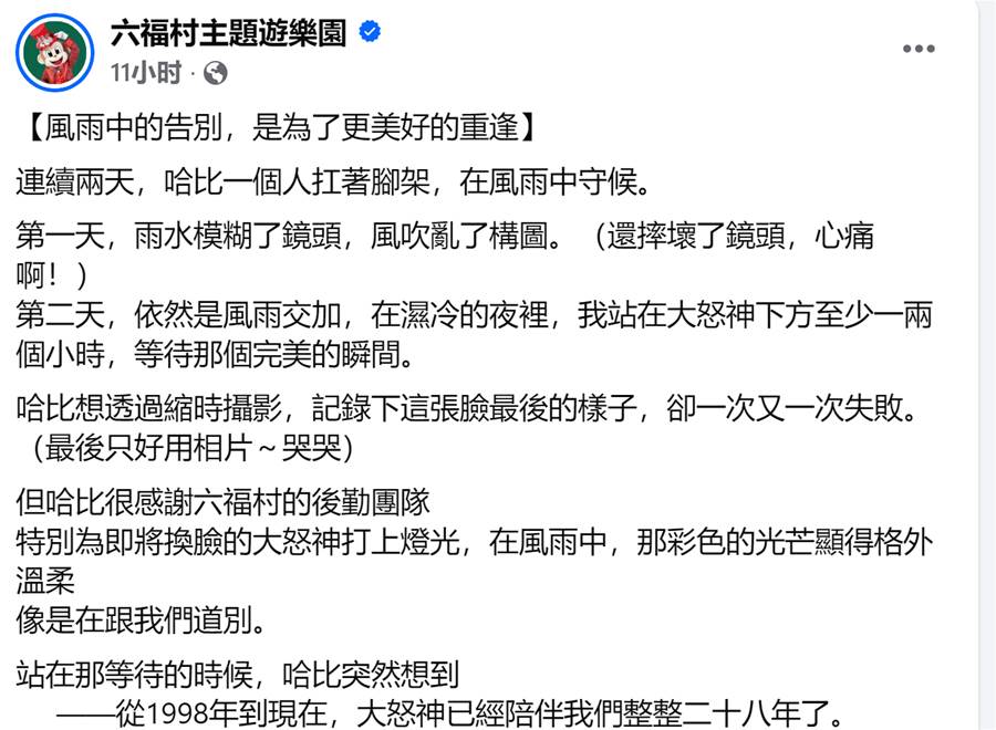 六福村人氣設施「大怒神」自1998年啟用以來,陪伴遊客整整28年,成為無數人童年與青春回憶的一部分。今(20日)六福村在官方臉書發文表示,為了讓大怒神以全新姿態延續精彩,園方將對其進行調整與維修,為這座17層樓高的經典設施「換臉」。消息一出,立刻掀起大量網友懷舊留言,感嘆「我的青春再見了」。