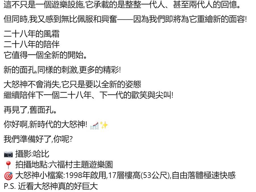六福村表示,雖然大怒神將進行調整,但它不會消失,只是換上全新面貌,為遊客帶來全新驚喜,也讓經典傳承下去。