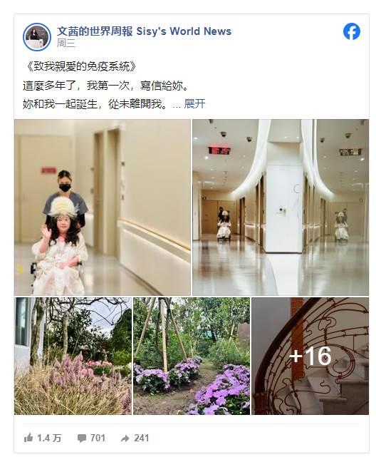 她在深夜發表一篇〈致我親愛的免疫系統〉長文,將免疫系統比喻成與自己一同誕生的姊妹,卻也是讓她一生都處于疾病狀態的原因。