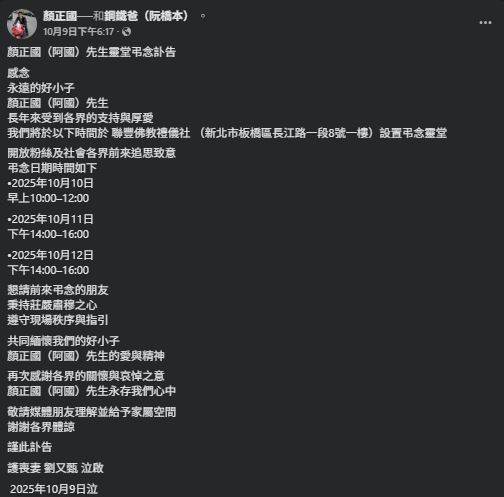靈堂位于台北第一殯儀館,整體佈置以白色胡蝶蘭與菊花為主,簡約素雅、氣氛莊嚴,家屬特別選用他在《少年吔》時期長髮造型的照片作為遺照,象徵他青春叛逆又真摯的一面,據悉,顏正國已于9日完成入殮儀式,親友深夜齊聚靈堂,替他慶祝最後的生日,陪伴至凌晨2點才散去。