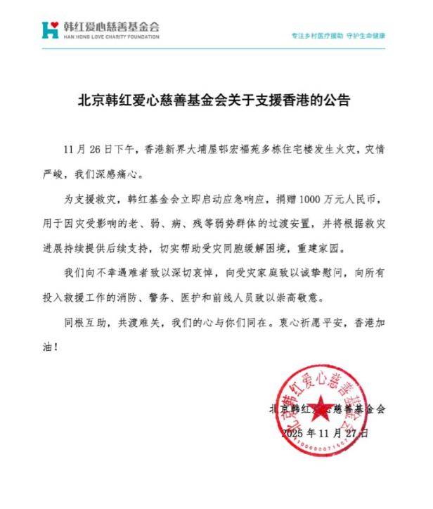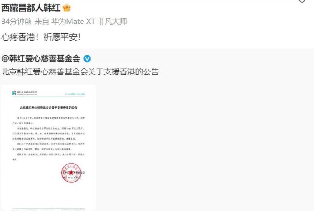韓紅本人也迅速在微博上轉發了基金會捐款公告,並附言: