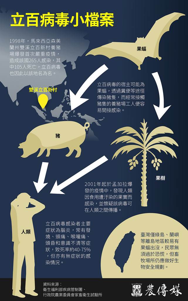 疾管署監測資料顯示,立百病毒首次在人類身上被發現是一九九八年的馬來西亞,隔年新加坡也發生疫情。
