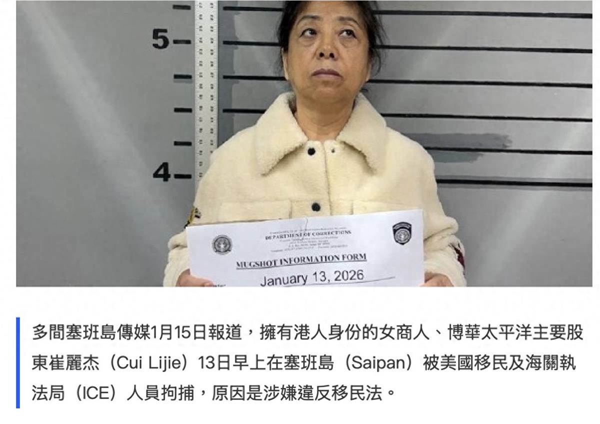 塞班島懲教署專員對媒體證實,現年68歲擁有香港人身份的崔麗杰正被關押在懲教署,因為涉及違反了移民法。崔麗杰是在塞班島的機場被拘捕,而根據當地的制度,作為在美國司法管轄區內的外國投資者,必須要持有有效的E-2C長期投資者簽證才能留在北馬里亞納群島——塞班島屬于這個群島中最大的島嶼。
