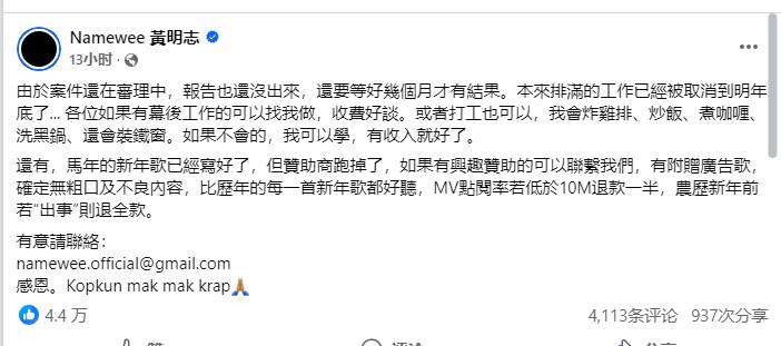 早前因捲入台灣網紅命案,而被延扣的大馬歌手黃明志,11月13日獲口頭保釋後,11月17日二度發文,這次竟然是找工貼文!