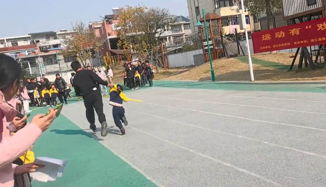 從鏡頭的拉近視角來看,父親一手抓住女兒的衣領,完全不顧女兒的腳步,只顧著自己奮力向前奔跑。女兒顯然有些措手不及,但父親完全無視,依然用力往前衝,仿佛他今天一定要贏得這場比賽。這一幕不僅讓在場的人捧腹大笑,也成為了網路上的熱議話題。