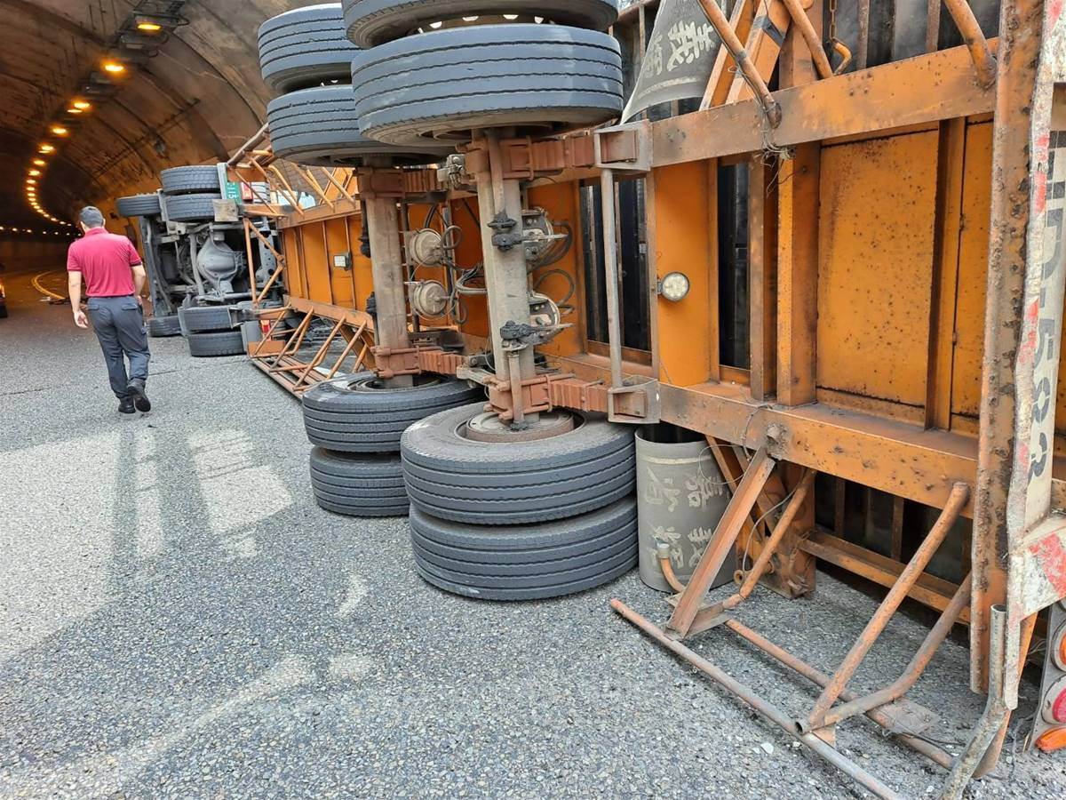 翻覆的聯結車車體側翻,車頂因撞擊而凹陷,佔用了隧道的大半個車道,導致南下車流一度受阻,能單線通行。