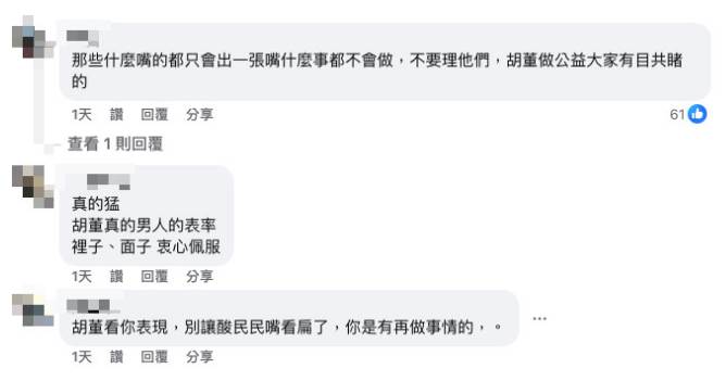 對此,大家都在下方驚呼「了不起!負責」、「胡董常常做善事,大家都知道,有良心的名嘴會說好話,只有沒良心爛嘴才會造謠」、「新竹之光」、「胡董就是霸氣,有些大老闆還做不到!胡董,讚讚讚」、「那些什麼嘴的都只會出一張嘴,什麼事都不會做,不要理他們,胡董做公益大家有目共睹的」。