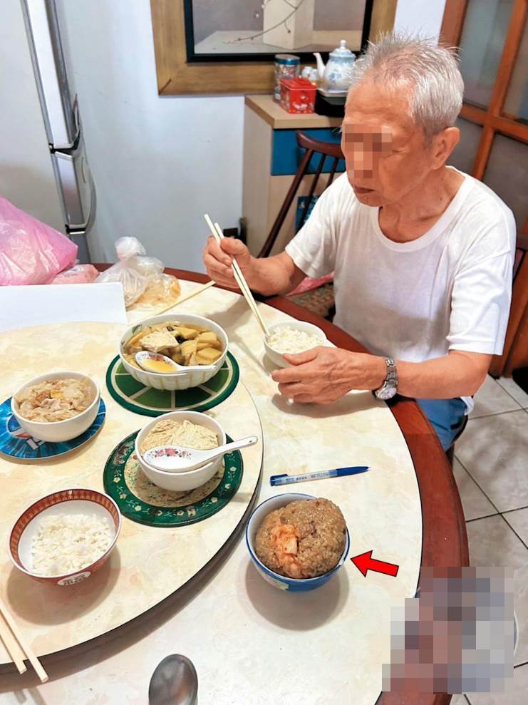 本刊致電行天宮查證後,廟方隔天特別送了一份油飯(箭頭處)給老翁。(讀者提供)