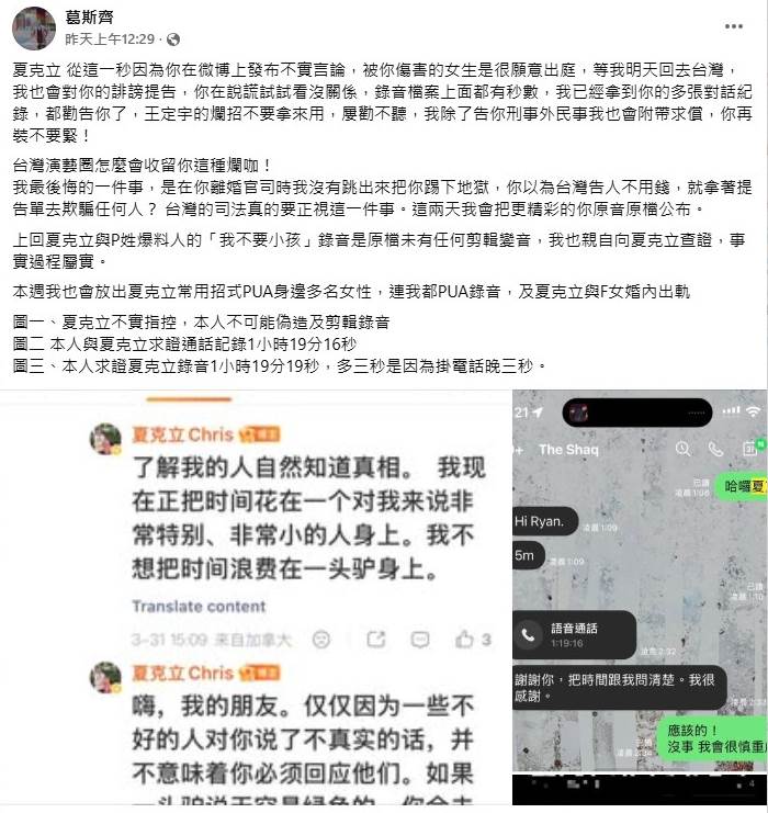 在我任期內確實有不同的女性找過我,釋出的錄音檔我也聽過,沒有經過任何剪輯,時間軸也很清晰。當時我也聯繫過夏先生求證,得到的訊息是矛盾不清楚的。P小姐除外,在2020年與夏先生超友誼的親密女士也曾與我聯繫,女方承認有[性.關.係]並有對話作證。記者葛斯齊的爆料內容全部屬實。