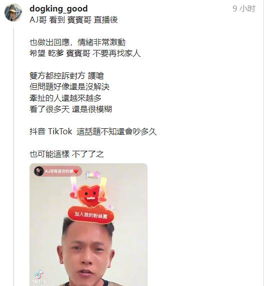 「公益網紅」賓賓哥(本名江建樺)在抖音擁有72萬粉絲,近來因與圤智雨、AJ哥(本名曹暐國)的紛爭,賓賓哥才在直播中崩潰痛哭。AJ哥19日也在抖音開直播氣炸反擊,指賓賓哥在爸媽面前,恐嚇要讓他們的孩子死,黑道也沒有這麼垃圾。AJ哥最後認了出獄後,發願要做公益救人,拜託賓賓哥給一條生路。