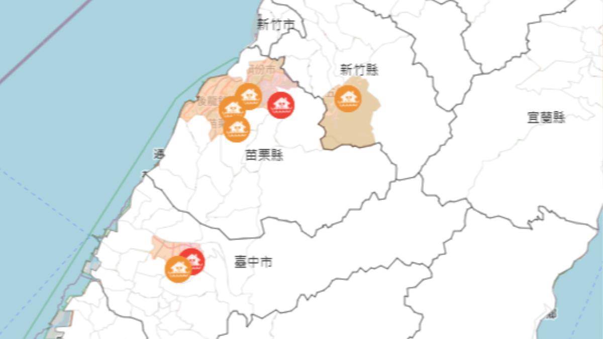 經濟部水利署針對3縣市發布淹水警戒,包括新竹縣五峰鄉;苗栗縣三灣鄉、造橋鄉、頭份市、苗栗市、 後龍鎮;臺中市豐原區、神岡區。