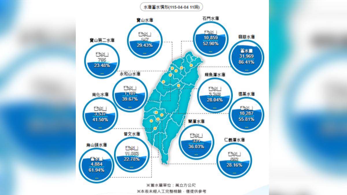 今日中南部大雨狂下,部分地區出現嚴重積水、淹水,然而,根據經濟部水利署資料顯示,大雨未填滿水庫,臺中德基水庫蓄水量僅達55%;苗栗鯉魚潭水庫達28%;南部最大的曾文水庫也僅有22.74%。