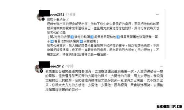 她也分享了自己每日思念丈夫的6個步驟,包括:「聞、抱他的衣服;躺他的枕頭;每天寫日記給他;偶爾哭著罵他沒有陪我一輩子;看著他的照片傻笑;最後哭著入睡。」她強調,這些行為是她面對失去的方式,也是自我療癒的一部分。