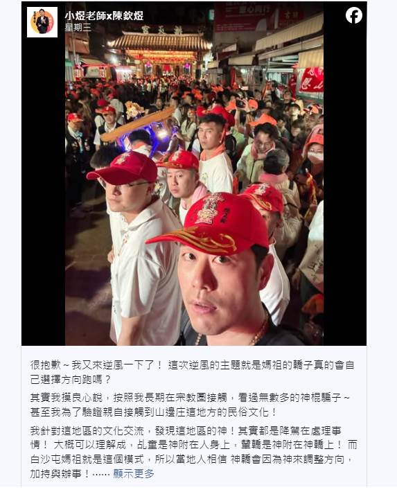 陳欽煜于15日在社群平臺發文,以「逆風」話題切入,直言:「媽祖的轎子真的會自己選擇方向跑嗎?」他表示曾親自接觸山邊莊的民俗文化,發現當地神明多以降駕方式處理百姓問題,因此當地民眾深信「神轎會因為神來調整方向」。