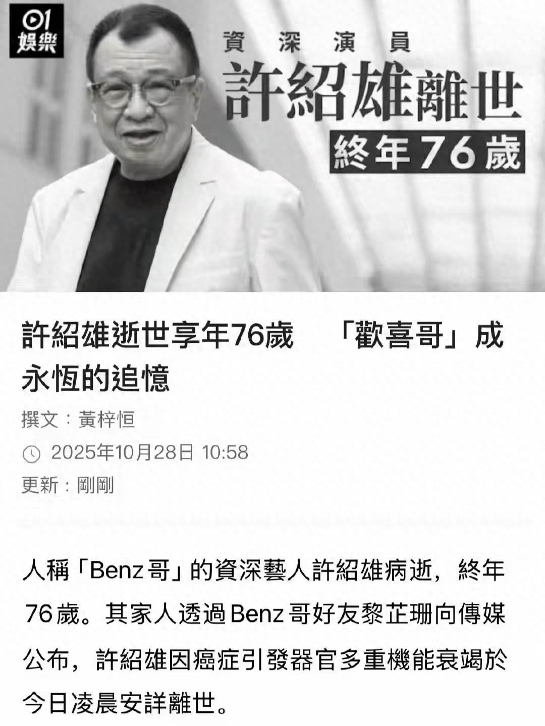 10月28日凌晨,76歲的香港明星許紹雄離世。